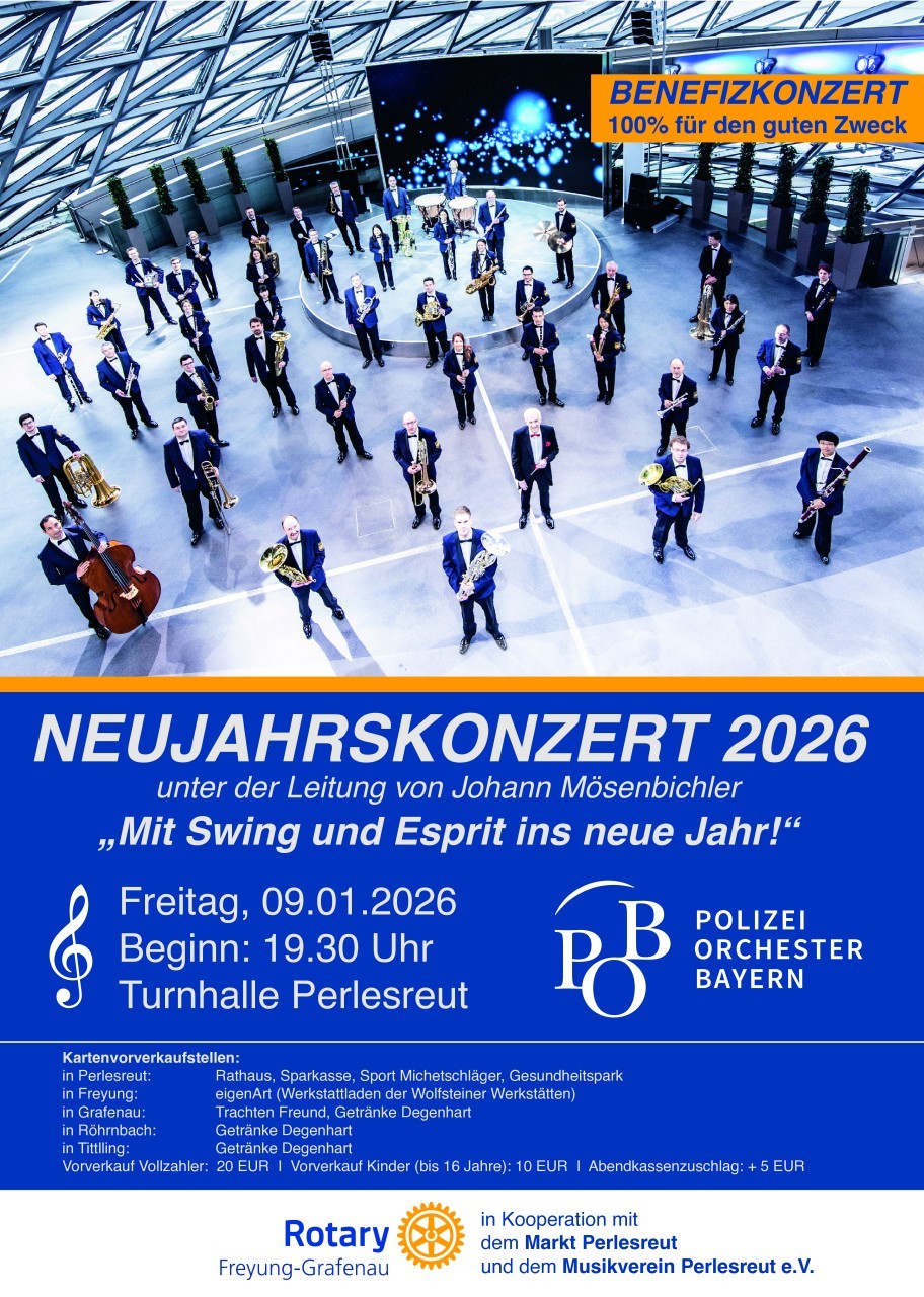 Der Rotary-Club Freyung-Grafenau lädt am Freitag, 9. Januar 2026, in Kooperation mit unserem Patenverein, dem Musikverein Perlesreut und dem Markt Perlesreut zum festlichen Neujahrskonzert in die Turnhalle der Grund- und Mittelschule Perlesreut ein. Beginn ist um 19:30 Uhr, Einlass ab 18:30 Uhr.