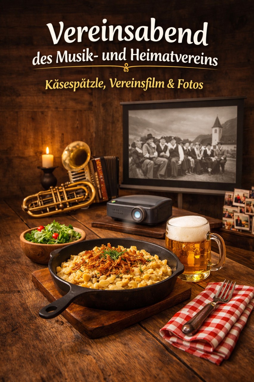 Einladung zum Vereinsabend mit traditionellem Käsespätzle-Essen, Vereinsfilm und Fotos.