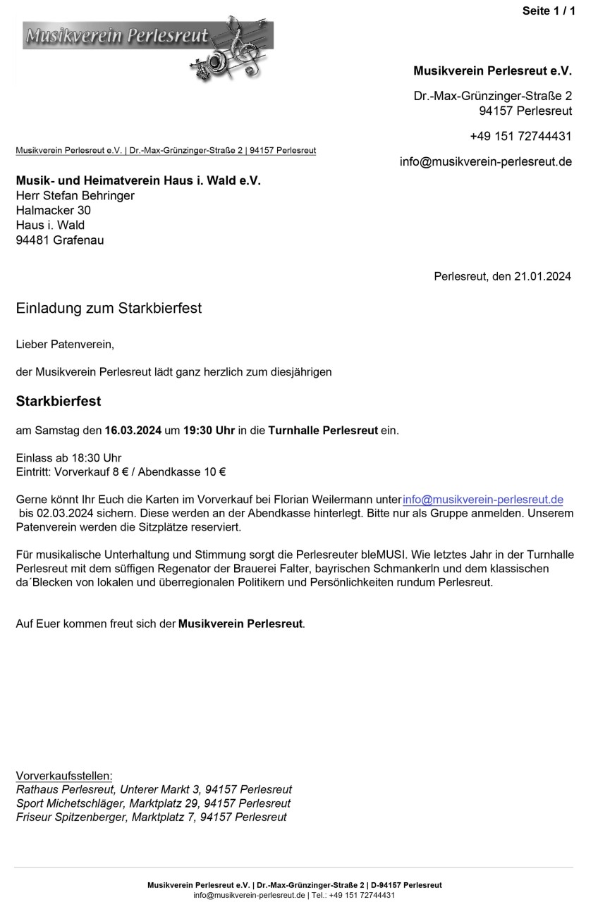 Unser Patenverein, der Musikverein Perlesreut lädt ganz herzlich zum diesjährigen Starkbierfest